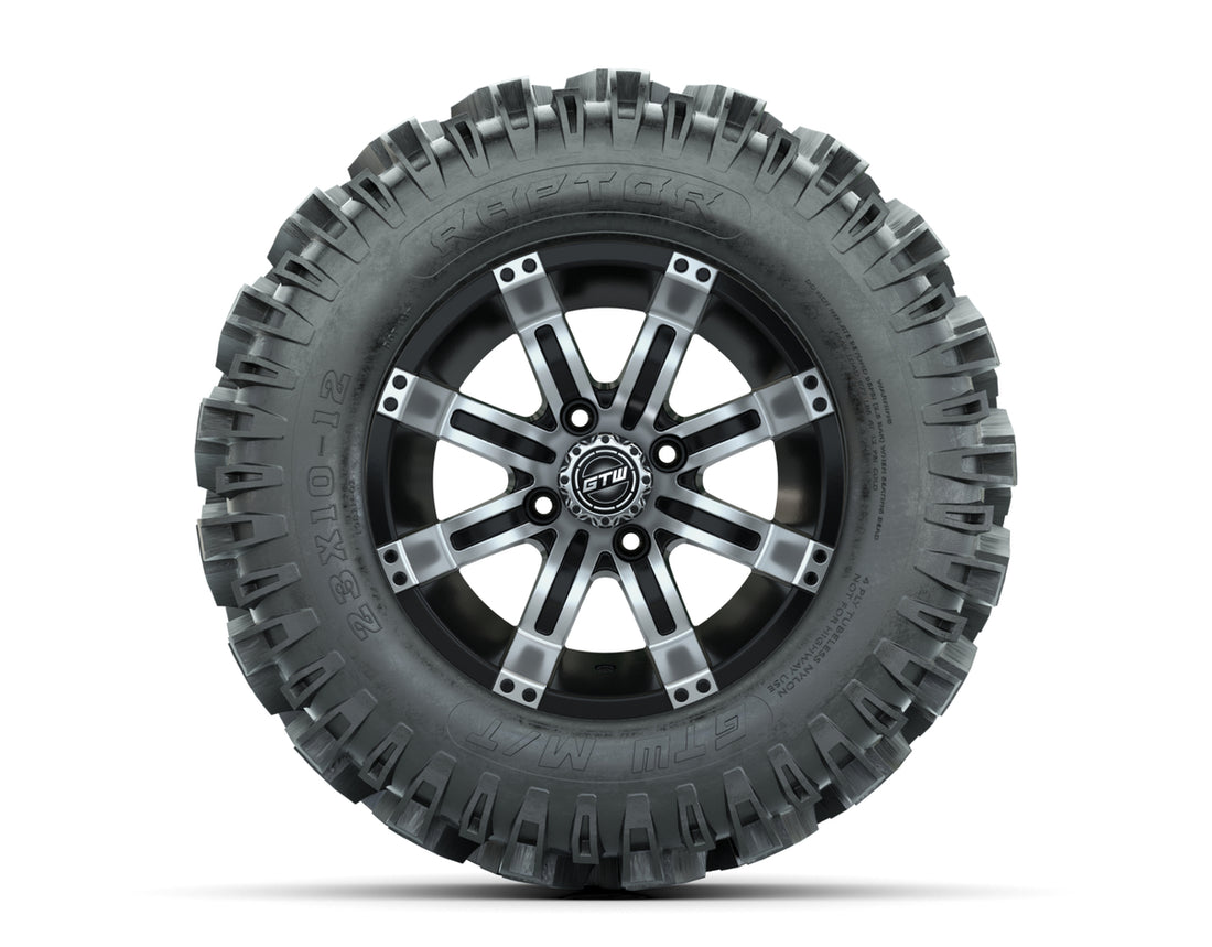 12” GTW TEMPEST BLACK AND MACHINED WHEELS WITH 23" RAPTOR MUD TIRES – SET OF 4