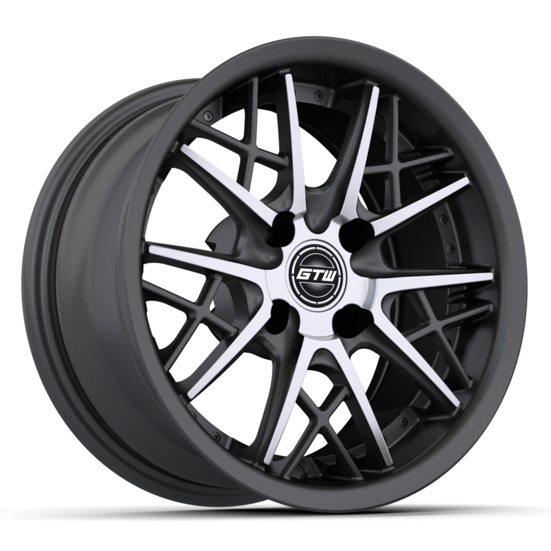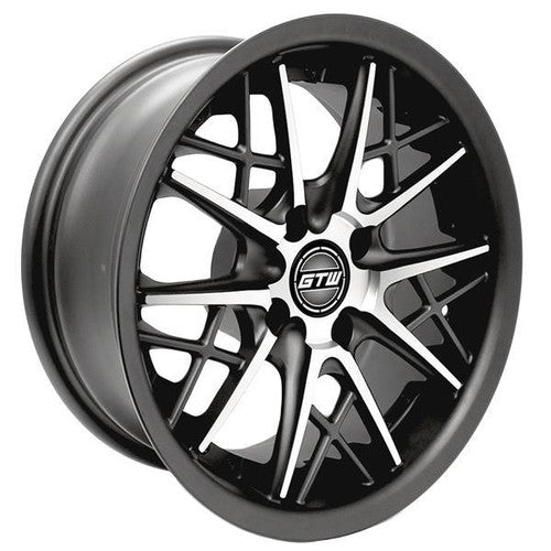 GTW® 14x7 Axis Street Wheel. Available in our industry leading Matte Gray/Machined finish and is constructed of solid cast aluminum for maximum strength & minimal weight. The Axis wheel has an exclusive GTW® Multi-Spoke design, dual finish spokes, recessed rim lip, and two-piece look. The Axis pairs great with our premium line of tires and accessories.