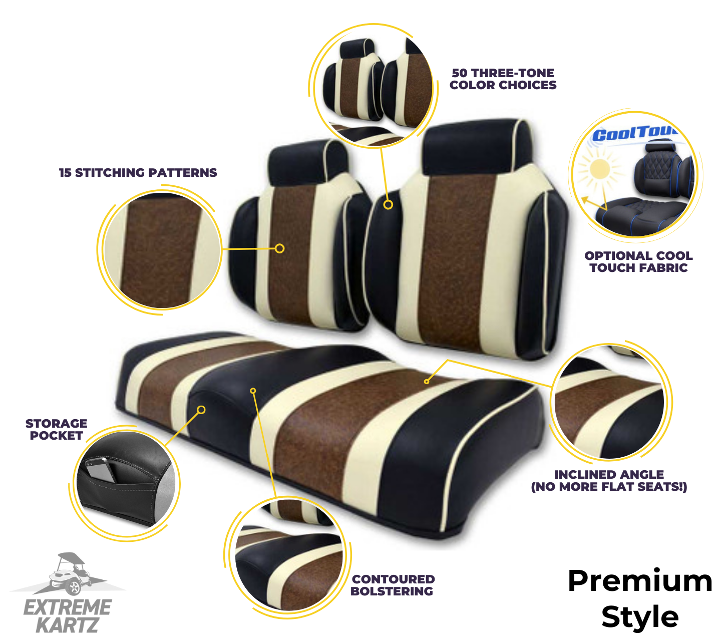This Lazy Life Premium Front Seat with Three Tone Highbacks is available for Club Car, Tomberlin, Evolution, Icon, EZ-GO and Yamaha Golf Carts.